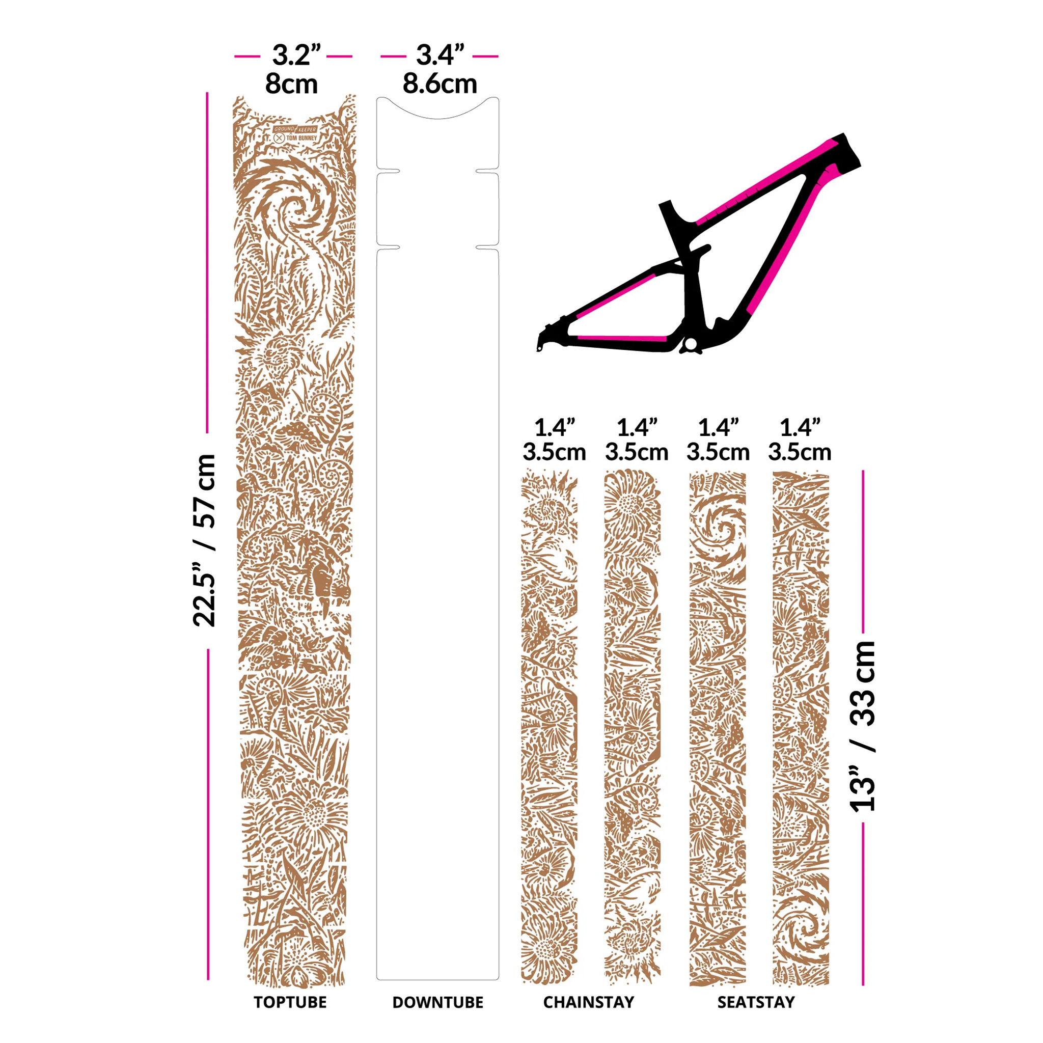 - Universal kit designed to fit all bikes and sizes. Includes 6 easy-to-trim pieces for top tube, downtube, chainstays, and seat stays